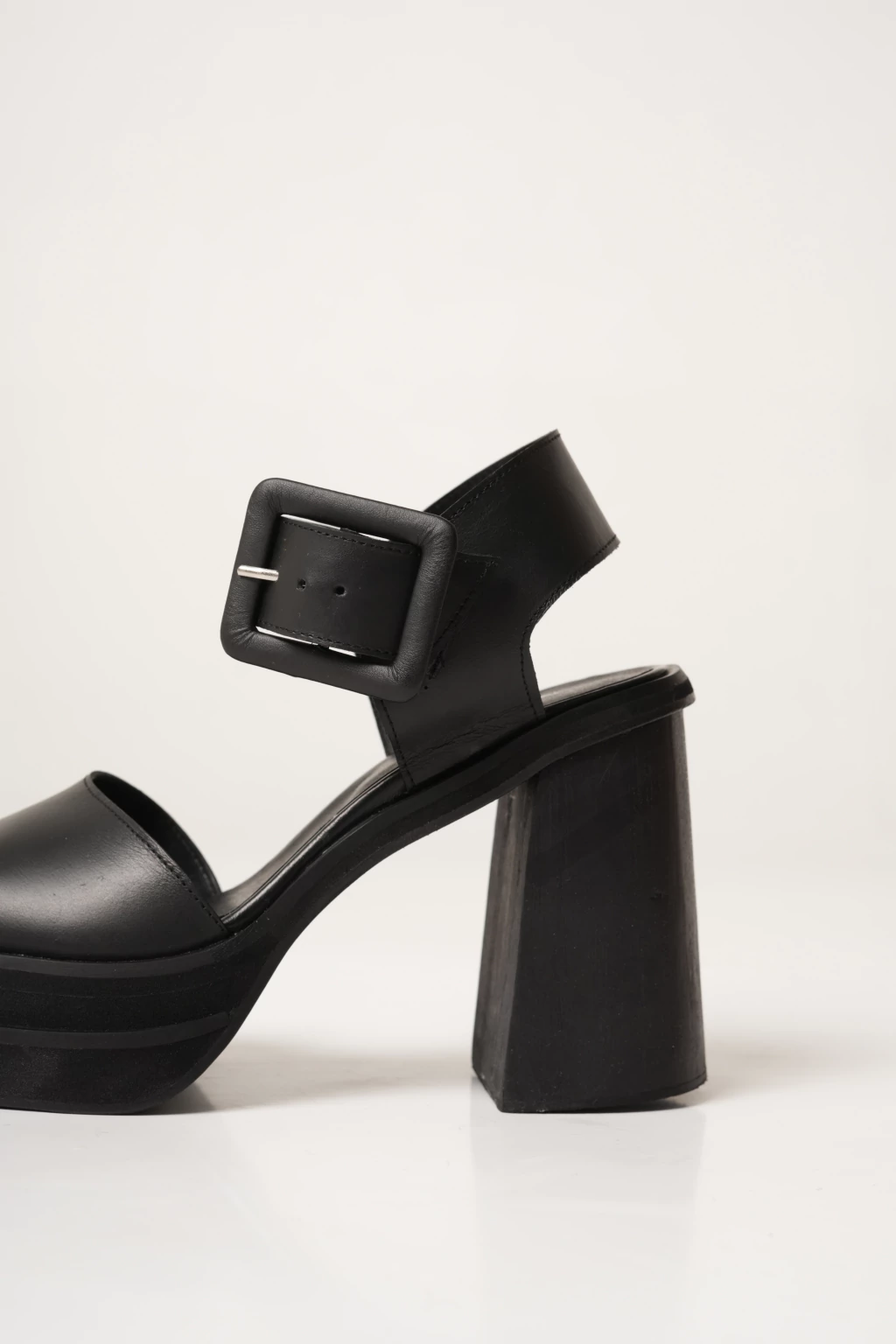Sandalia de cuero. Hebilla cuadrada de 2x2. Taco de madera de 12 cm, doble plataforma de 5 cm.