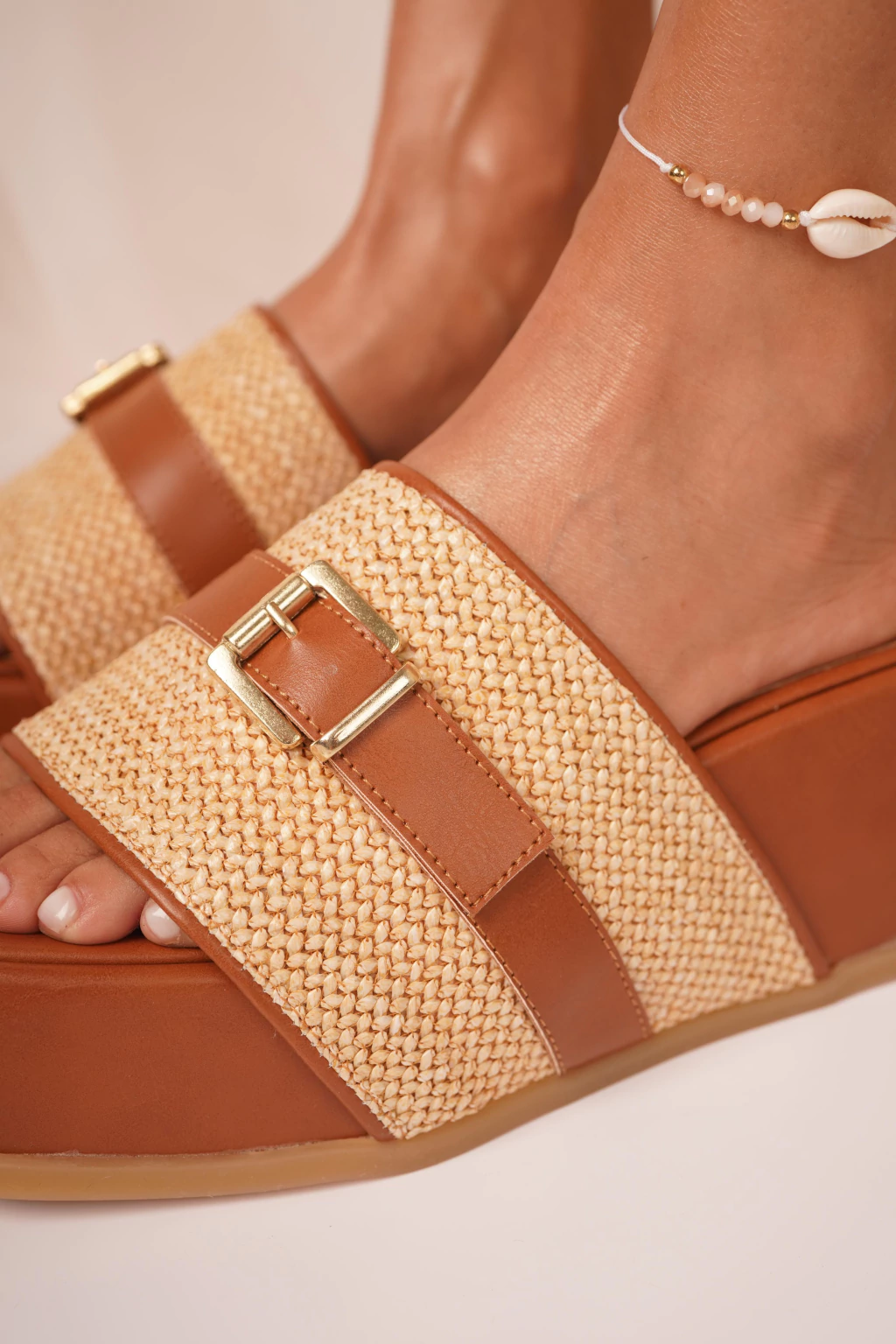 La capellada está confeccionada en faja de rafia con un detalle distintivo de cinto y hebilla, que aporta un toque sofisticado y personalizado a tu calce. Su base es una plataforma de 6 cm realizada en EVA expandida y forrada en cuero vegano, ofreciendo ligereza y confort para que puedas caminar todo el día sin esfuerzo.