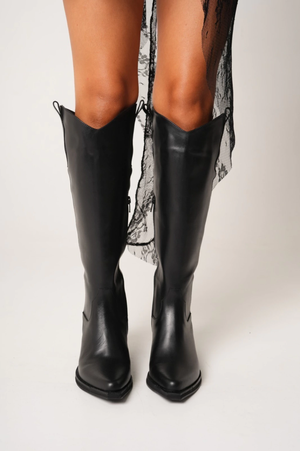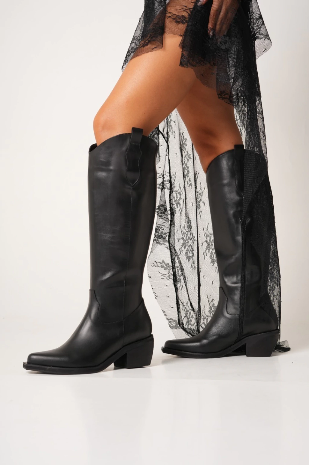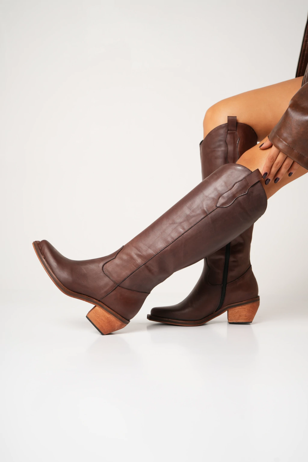 Bota texana de cuero.Cierre interno.Caña alta de 41cm.Taco de 5cm. Circunferencia de caña 36cm.
