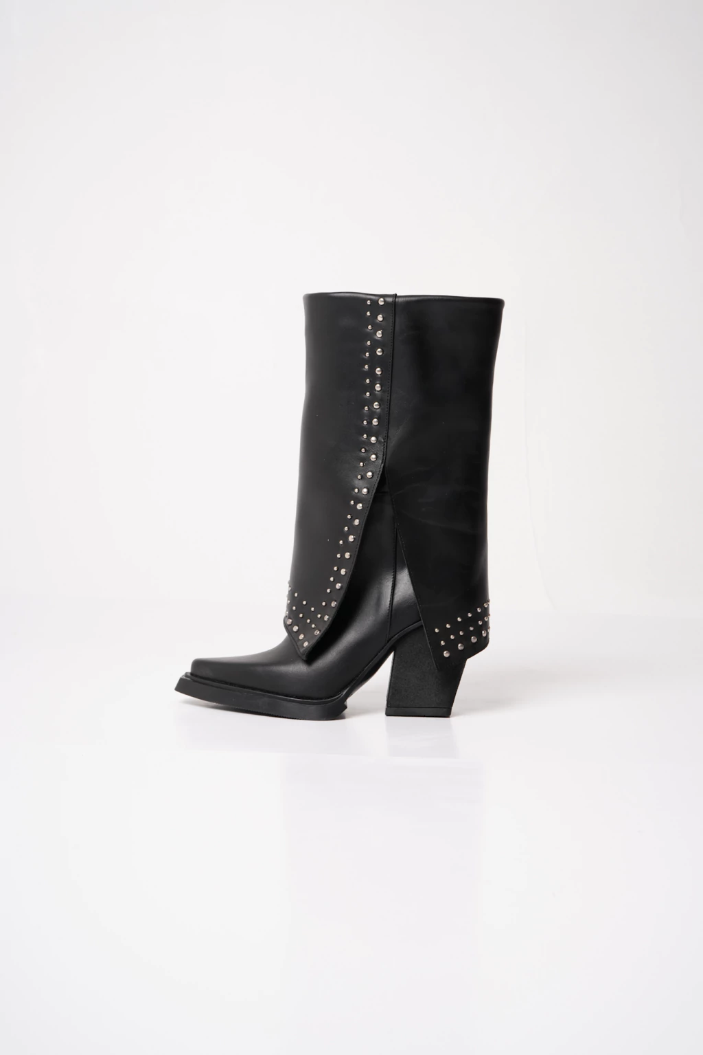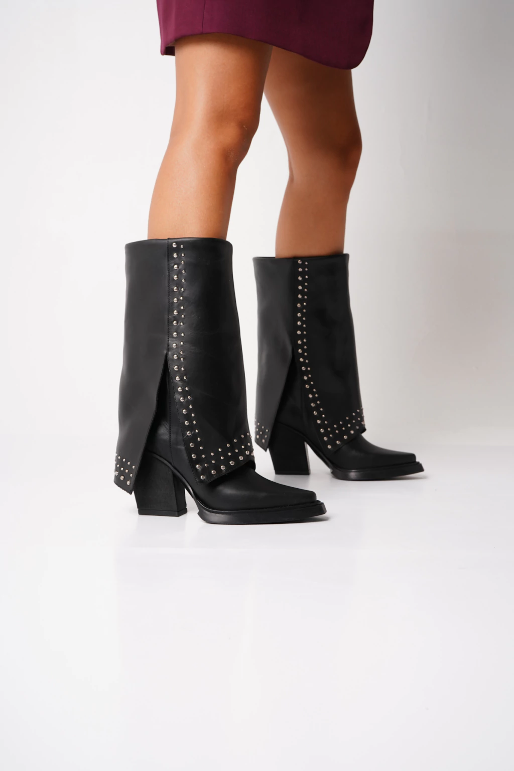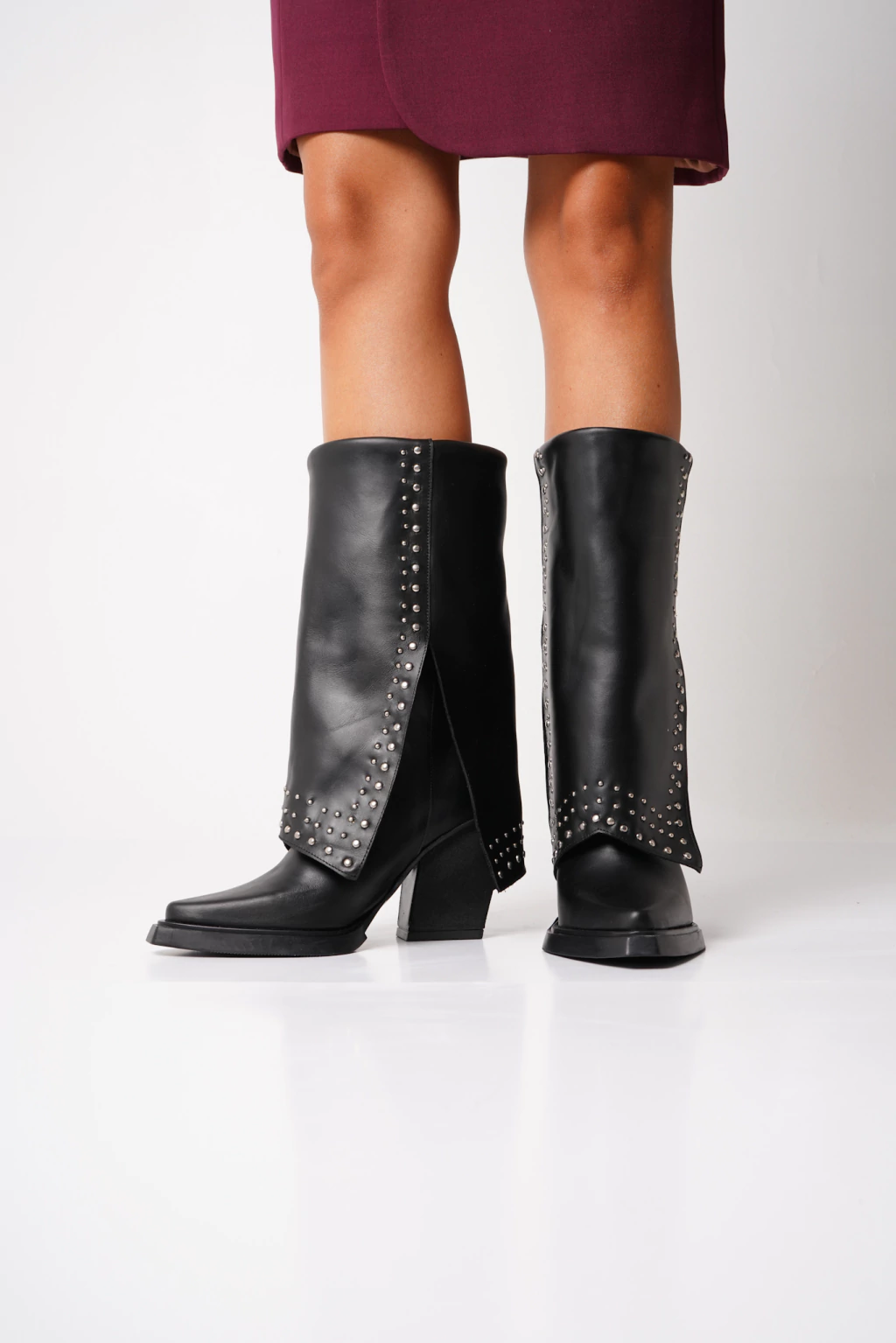 Texana de cuero, volcada con tachas. Base de goma inyectada. Caña de 26cm. Plataforma de 1,5cm, taco 9cm.