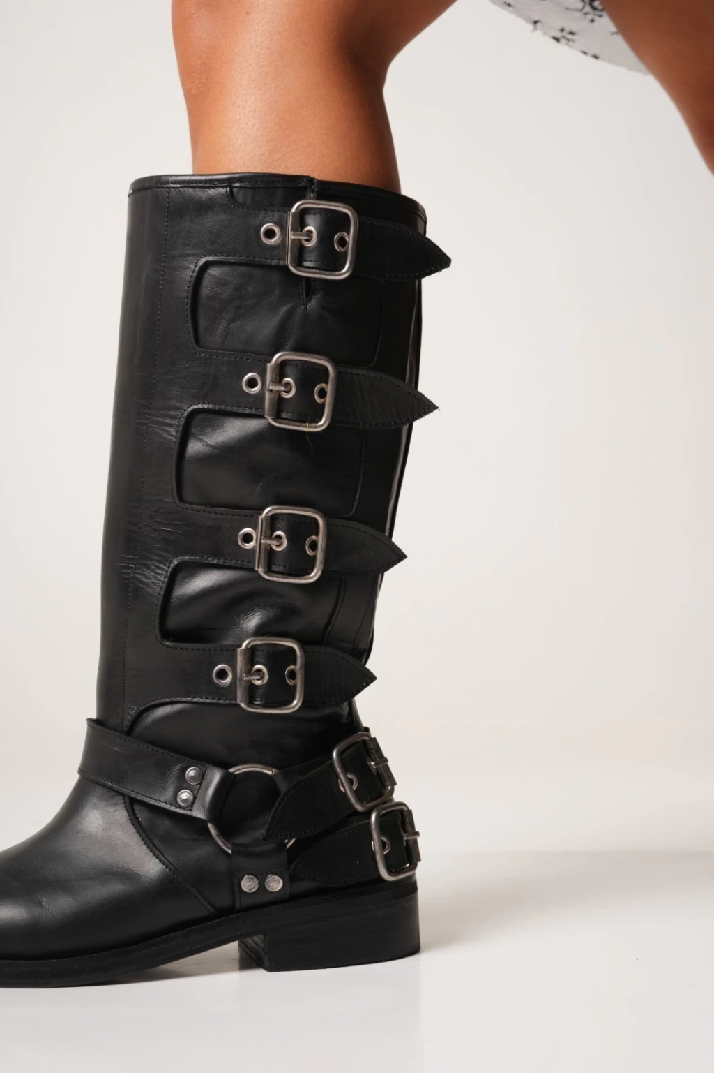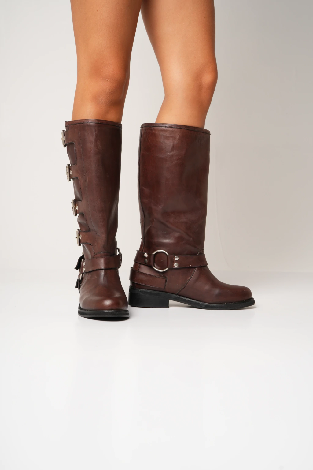 Bota de cuero. Caña de 33cm. Sin cierre. Hebillas plateadas. Taco de 3cm. Circunferencia alta de caña 36cm.