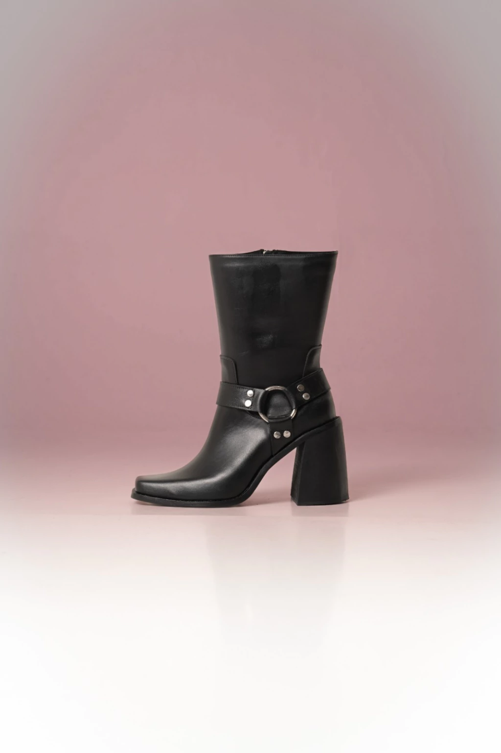 Bota de cuero. Caña media de 19cm. Cierre interno. Punta cuadrada. Taco de madera de 9,5cm. Detalles con tiras de cuero y argolla niquel.